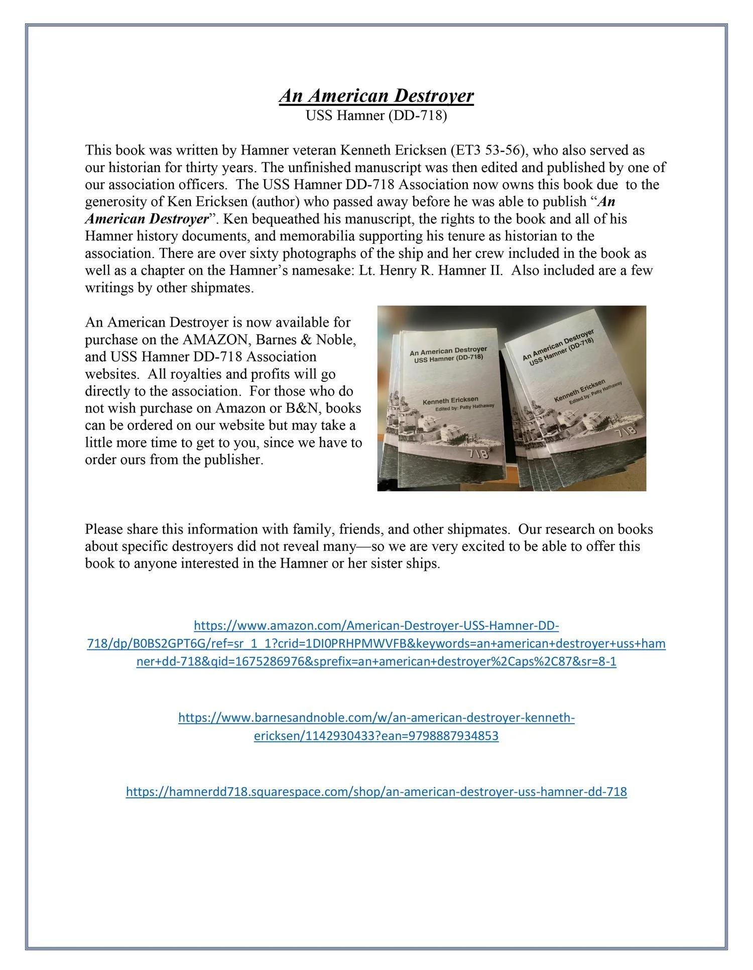 We have been fortunate to have two books written about the Hamner. Our first book: “An American Destroyer: USS Hamner DD-718” was written by Ken Ericksen (ET3 1953-56) and published in the fall of 2022.